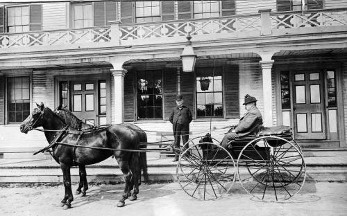 The Elm House saw both prosperity and its eventual end. It all began when Uncle Sam Bean took ownership and bestowed upon it the name "Elm House." Under Sam Bean’s astute management, the inn underwent significant changes. The old gable roof was replaced, and a full third story was added, complete with a flat roof and a charming lantern cupola. In the images below, you can see Mr. Bean proudly displaying his livery business, showcasing a variety of carriages available for hire.
