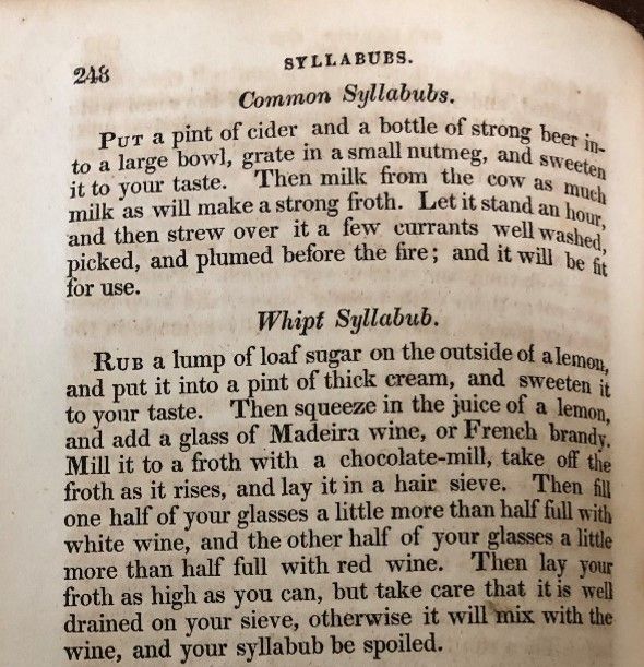 Syllabub: Posset's Playful Sibling Syllabub, akin to posset, is a delightful family member with its own captivating story. These concoctions share a frothy crown of cream, perched atop an array of alcohols such as cider, beer, or wine, spiced with a touch of magic - spices and sugar. Our journey begins with the Common Syllabub, embracing the dynamic duo of Cider and Beer. Yet, if you're ready for an adventure, the Whipped or Solid Syllabub ventures into the realm of wine. The wise old cookbook even suggests embracing the bold character of Madeira (the red wonder) or perhaps a spirited brandy.